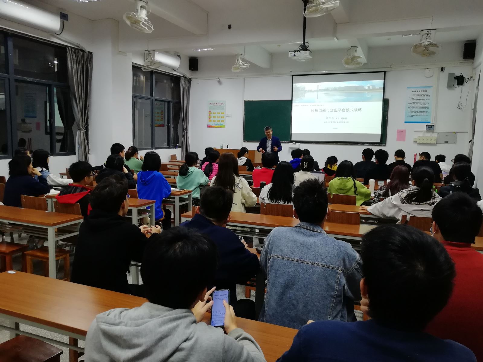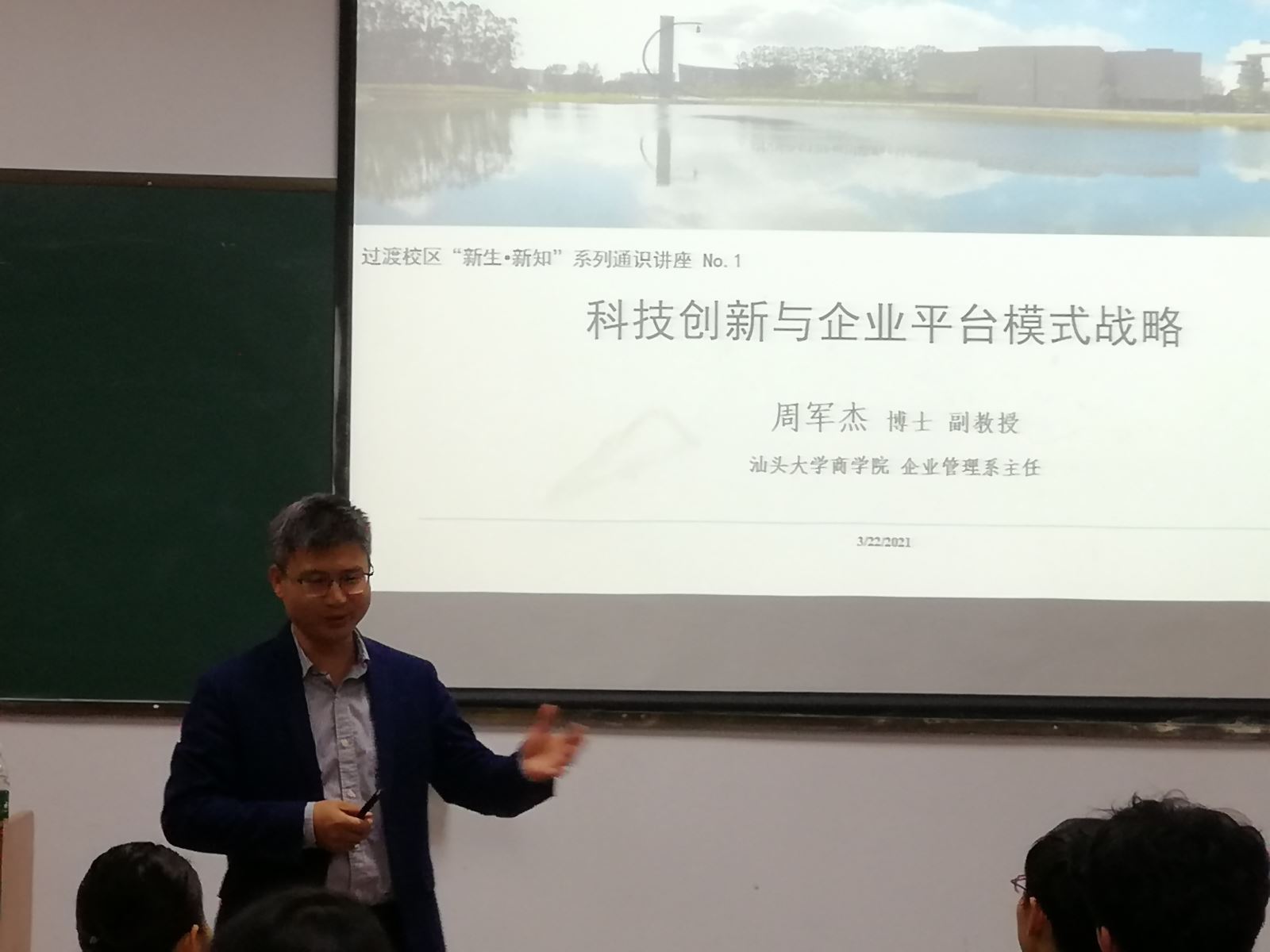 2021年3月22日晚,伟德国际唯一官网入口过渡校区首场“新生·新知”系列通识讲座在过渡校区电教室5顺利举行。本次讲座由公司和过渡校区综合办公室联合主办,邀请公司企业管理系主任周军杰副教授为同学们作“科技创新与企业平台模式战略”的主题讲座。bevictor伟德官网工商管理2020级专业班主任刘久兵博士、过渡校区辅导员以及bevictor伟德官网、理公司、文公司等公司近一百名同学参加了本次讲座。