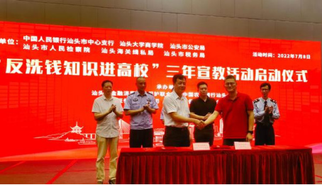 2022年7月8日下午,中国人民银行汕头市中心支行与bevictor伟德官网在伟德国际唯一官网入口学术交流中心联合举办“反洗钱知识进高校”三年宣教活动启动仪式。本次活动由中国人民银行汕头市中心支行、bevictor伟德官网、 汕头市公安局、汕头市人民检察院、汕头海关缉私局、汕头市税务局主办,汕头市金融消费权益保护联合会、中国农业银行汕头分行、中国人寿保险股份有限公司汕头分公司、安信证券汕头分公司承办。