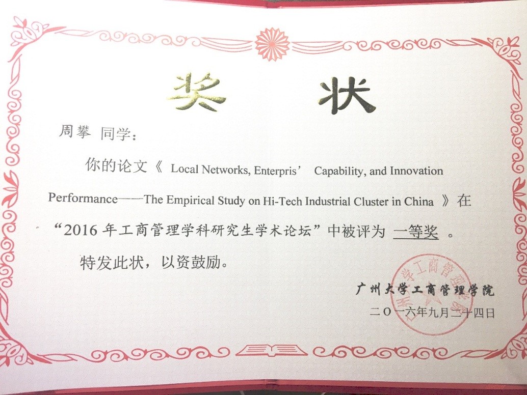 公司研究生黄舟骋、周攀参加了本次论坛,周攀的投稿论文《Local Networks, Enterpris’ Capability, and Innovation Performance——The Empirical Study on Hi-Tech Industrial Cluster in China》被评为一等奖。