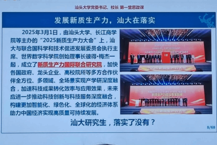 这次思政课不仅让广大师生对新质生产力有了更深入的了解,更激发了大家对科技创新和产业创新的热情。汕大将继续秉持“有志、有识、有恒、有为”的校训精神,不断追求卓越、勇攀高峰。在未来的日子里,汕大师生将携手并进,共同书写伟德国际唯一官网入口在新质生产力发展中的新篇章!