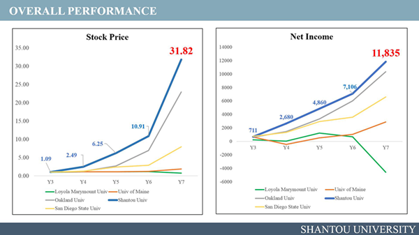 在为期10周的远程比赛阶段,汕大代表队在确定公司名称和进行角色分工后,便开始接管这家经营了两年的公司。通过对模拟世界中的市场环境、经济状况以及竞争对手的战略进行分析,参赛队员们确定了产品的定位以及公司长远发展的战略方向。在企业经营的过程中,公司所处的本国市场与国外市场都出现了很多突发的状况,市场的扩张与紧缩,原材料的价格起伏以及消费者偏好等等不稳定因素时刻影响着公司的战略决策和经营成果,竞争对手的策略更是使得局势跌宕起伏、竞争愈发激烈。汕大代表队的参赛成员们不骄不躁,综合考虑各方因素,谨慎地做出每一期战略决策,取得了不俗成绩。经过长达10周的用心经营,汕大代表队的公司股价持续稳定增长,始终保持在行业第一的水平,为之后的实地竞赛夯实了基础。