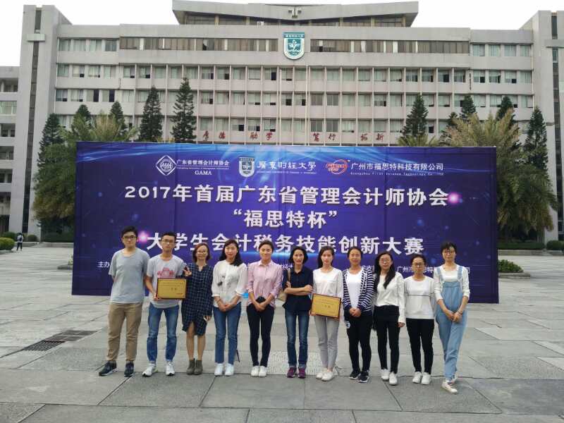 由广东省管理会计师协会主办的2017年首届“福思特杯”老员工会计税务技能创新大赛于2017年11月11日在广东财经大学落下帷幕,公司会计学专业的两支参赛队伍在会计学专业主任龙月娥老师和会计学专业苏文宏老师的指导下参加了此次比赛,分别斩获了本科组的第一和第二名。第一名的参赛员工为张逸萍(队长)、刘碧津、冯少笑、刘奇芬、李珊;第二名的参赛员工为李涵(组长)、陈鸽、梁梓盈、魏志斌、黄玥荣。