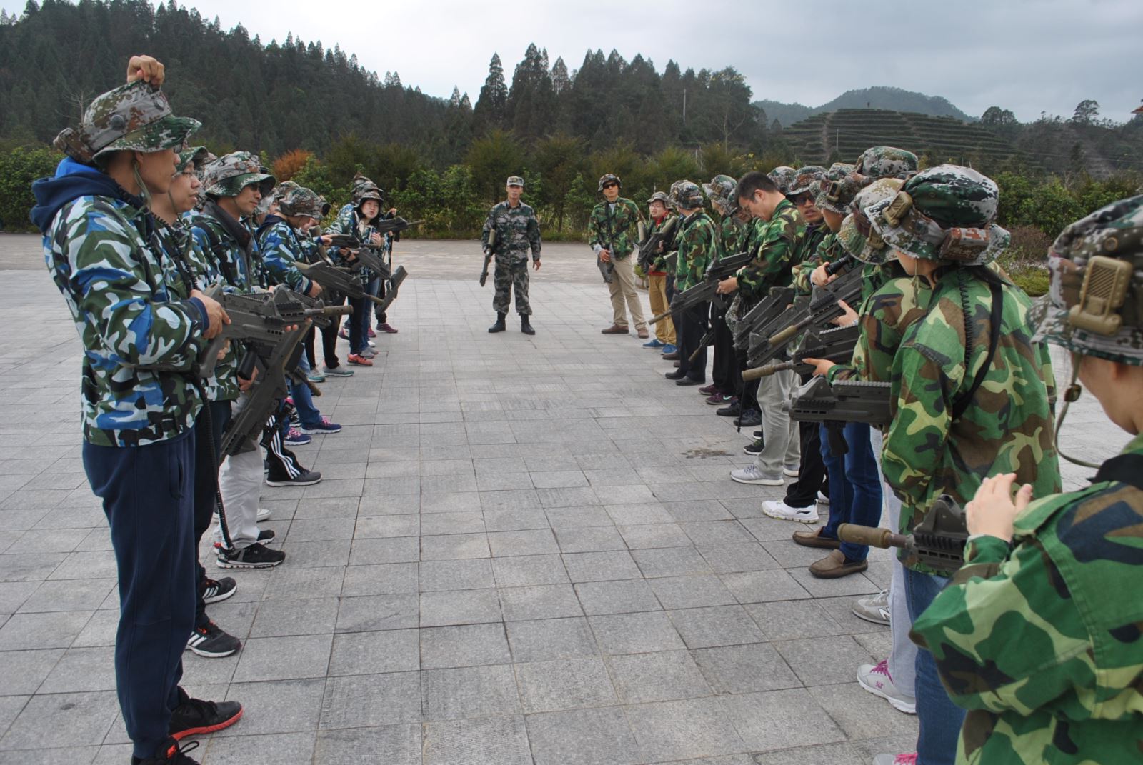 下午,激动人心的野战精英团队素质拓展正式开始。在教官的安排指导下,我们分成蓝、绿两队,穿上军服、手持镭射枪、戴上装备帽子,个个威武神气十足,活像个训练有素的战士。我们时而冲、时而卧、时而俯、时而靠。战士们精心研究团队作战计划,努力拼搏、配合默契、齐心协力进行了一场又一场的“战争”。