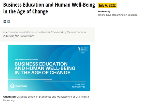 2022年7月6日下午,俄罗斯乌拉尔联邦大学经济管理公司举办主题为“Business Education and Human Well-Being in the Age of Change”(变革时代的商业教育与人类福祉)的国际会议。