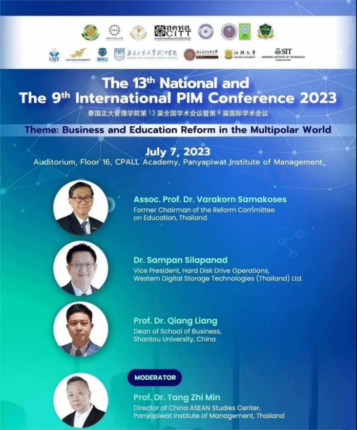 2023年7月7日,由泰国正大管理公司(以下简称“PIM”)主办、bevictor伟德官网联合承办的第13届全国学术会议暨第9届国际学术会议在泰国曼谷隆重举行,会议的主题为“多极世界中的商业和教育改革”。bevictor伟德官网经理梁强教授、副经理郭功星副教授、台湾研究所所长种照辉副教授受邀参加。