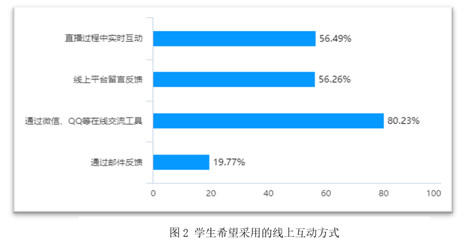 对于线上教学形式的选择方面,77.5%的教师会综合使用多个网络平台进行线上教学,选择的教学形式包含直播的教师占比为62.5%,选择“直播+录播” 形式的占37.5%。在与员工互动的方式选择上,90%的教师选择“通过微信、QQ等在线交流工具”。