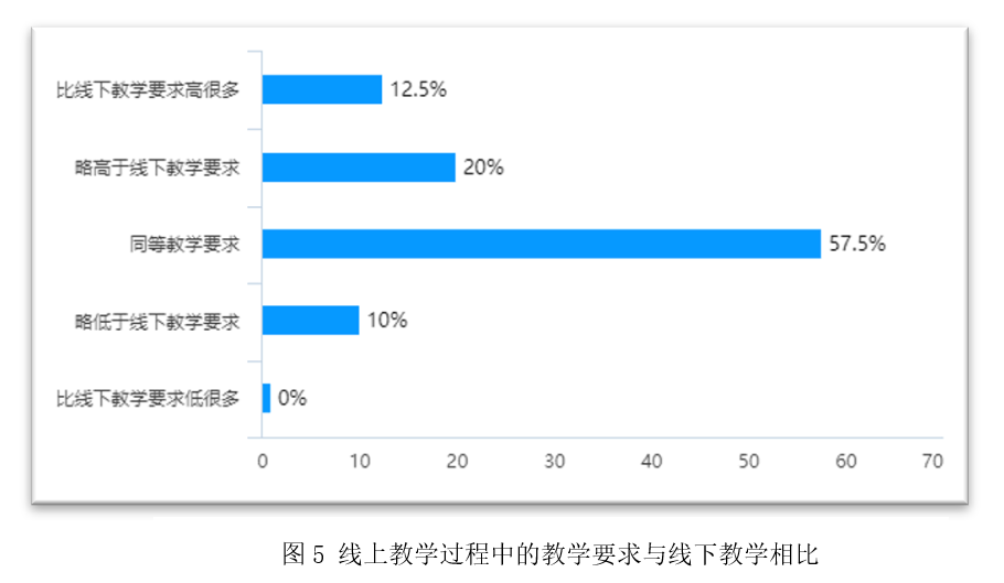 线上教学过程中的教学要求与线下教学相比,57.5%的老师表示同等要求, 32.5%的教师选择比线下要求高。这体现了公司教师在特殊时期以新形式开展教学,仍然秉持高标准严要求的责任态度。