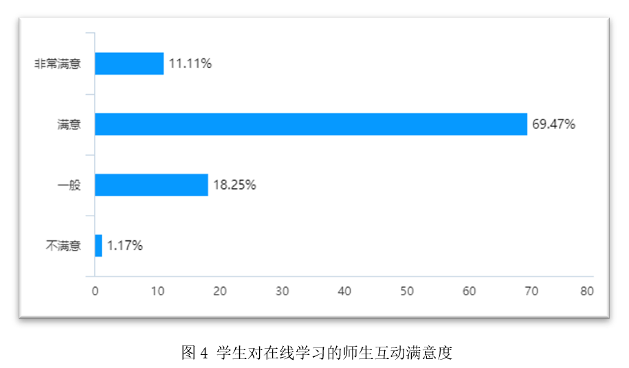 对在线学习中的师生互动总体情况,员工的满意度也较高,选择非常满意和满意的占80.58%,表示不满意的仅1.17%。