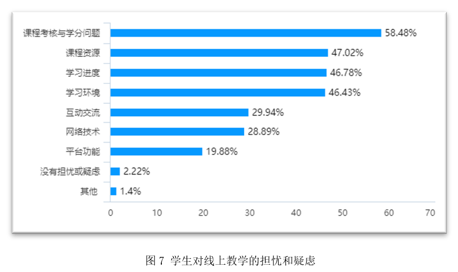调查显示,66%的员工对在线学习感到有一定压力但能够克服,22%的员工表示压力不大,9%的员工表示有很大压力,对开展学习感到困难。而员工对线上教学的担忧或疑虑最多的从高到低依次是课程考核与学分问题、课程资源、学习进度和学习环境。