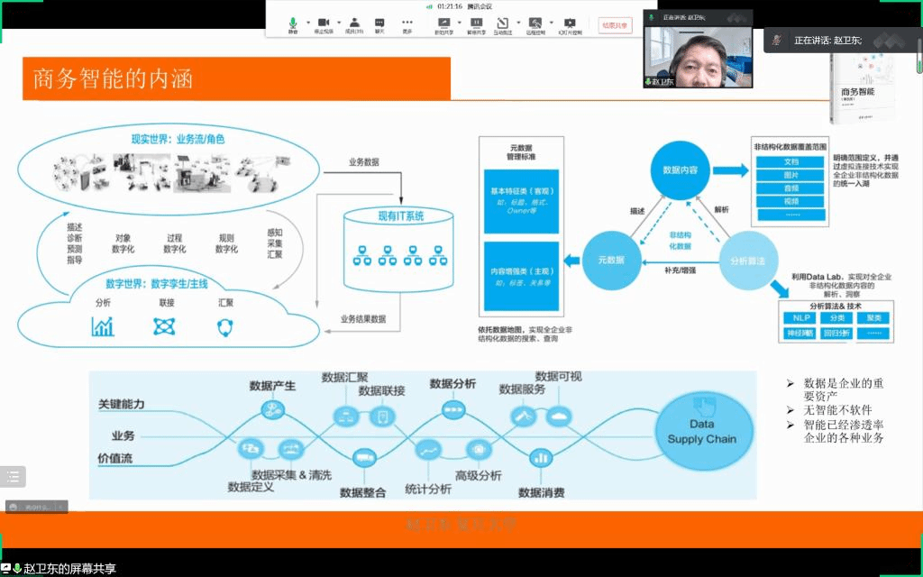 15时,师生通过腾讯会议听取了复旦大学赵卫东老师《商业中的数据分析价值》的直播讲座,了解了当下商业数据分析技术的发展现状和应用前景,将专业学习与市场需求结合起来。