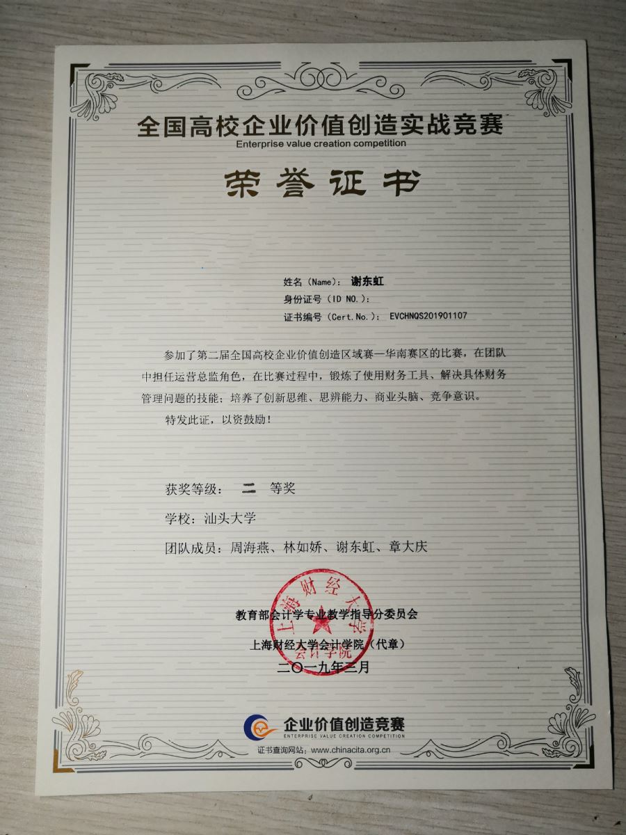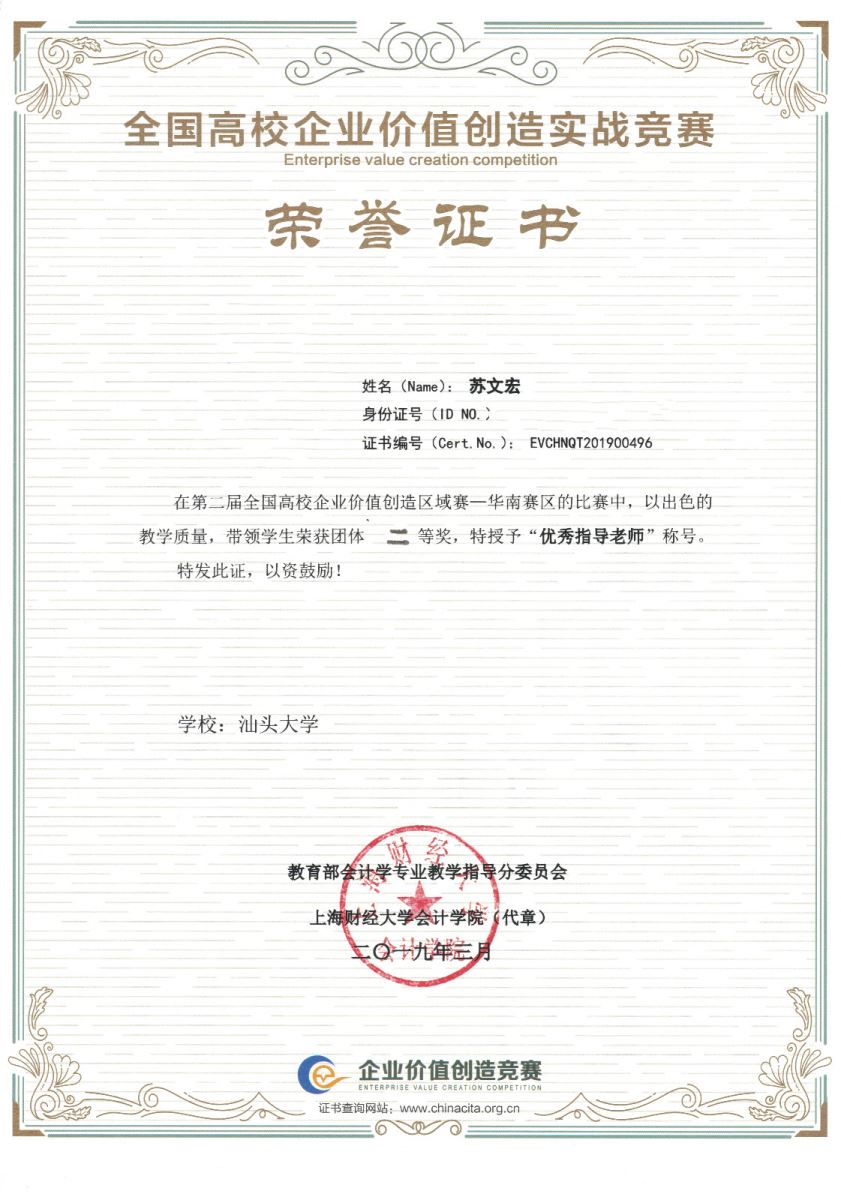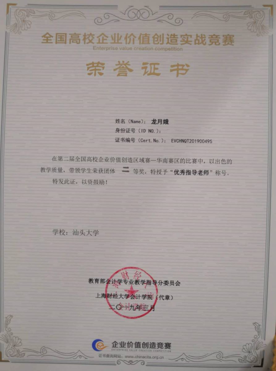 2019年3月31日,教育部会计教指委主办的第二届企业价值创造(EVC)大赛华南赛区决赛在广州举行。经过激烈角逐,公司2016级会计学专业本科生周海燕、林如娇、章大庆和谢东虹组成的团队凭借扎实的专业知识和出色的团队合作精神荣获华南赛区EVC大赛团队二等奖,指导老师龙月娥和苏文宏也分别获得了华南赛区企业价值创造大赛优秀指导老师二等奖。