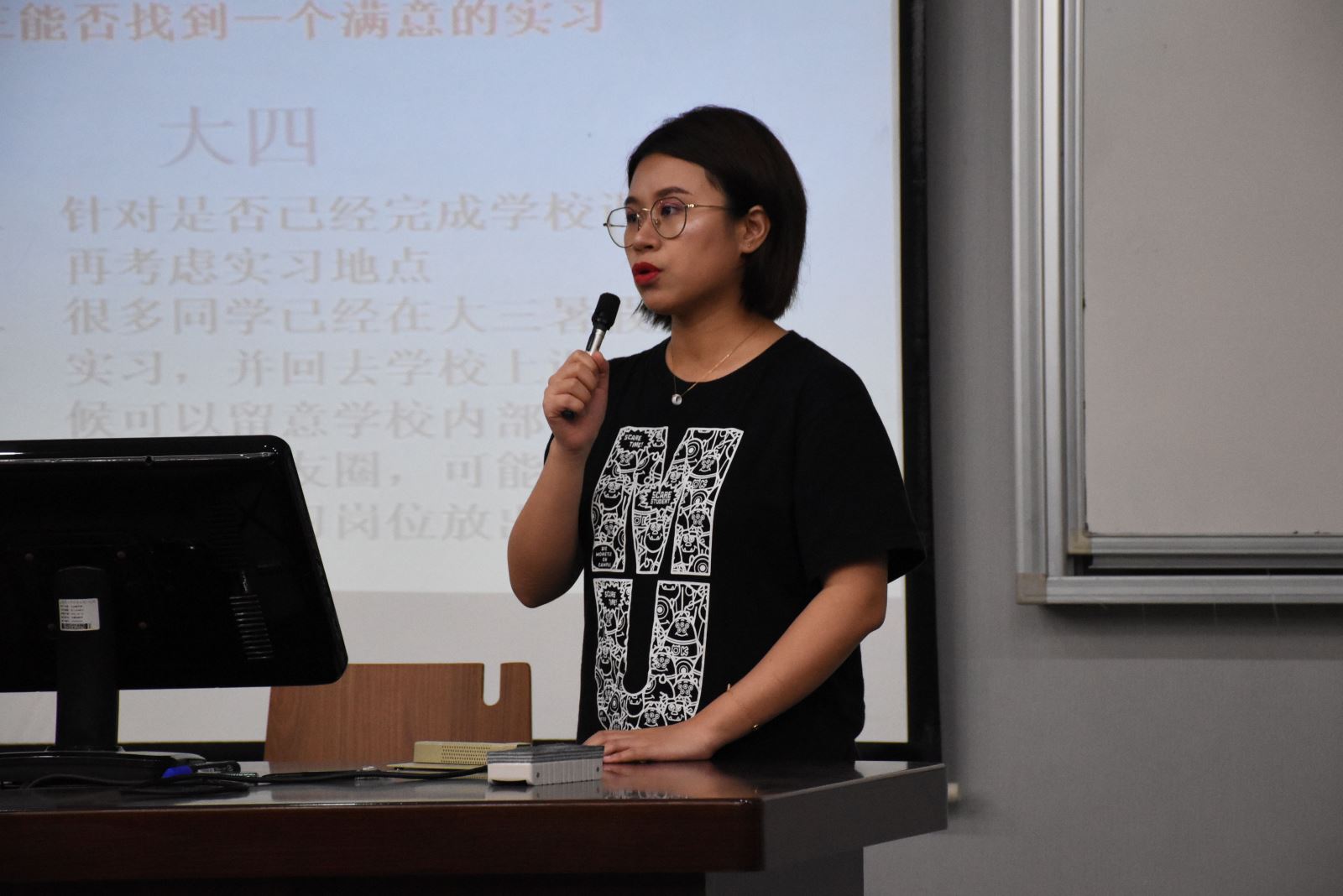 甄丽嫦同学则以她在陆逊梯卡华宏(东莞)眼镜有限公司(意大利跨国公司)实习一年的经历来阐述她对实习以及就业方面的见解,她认为把握住实习时机非常重要,甚至将影响到offer的获得。此外,她还分享了一些她认为比较有用的求职公众号给在场同学,希望大家能够借助这些资源,顺利找到心仪的工作。