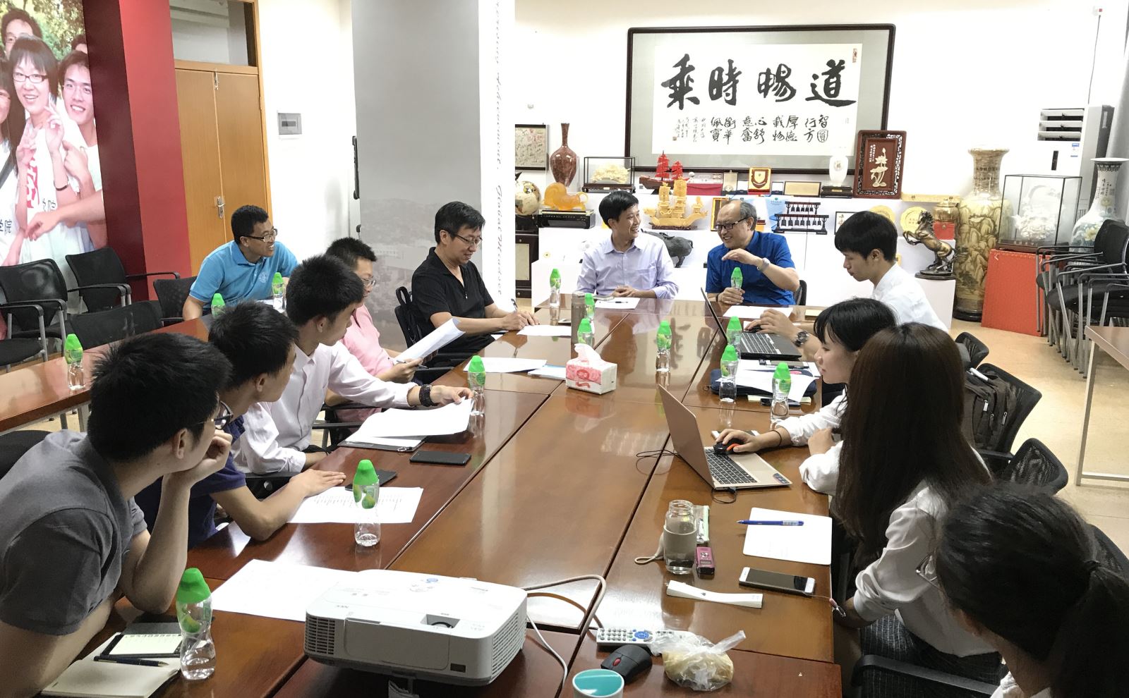 2017年5月22日,汕头市合胜百货有限公司郑志远总经理携其管理团队莅临公司,与公司吕源经理、卜祥智副经理、市场营销专业主任曾宪扬老师、郭功星老师进行了深入交流,并现场听取由公司市场营销专业的员工团队(2014级员工高洁仪、欧雪珺、庄佳仪、李国杰、杨荣彬)完成的校企合作项目交流分享。