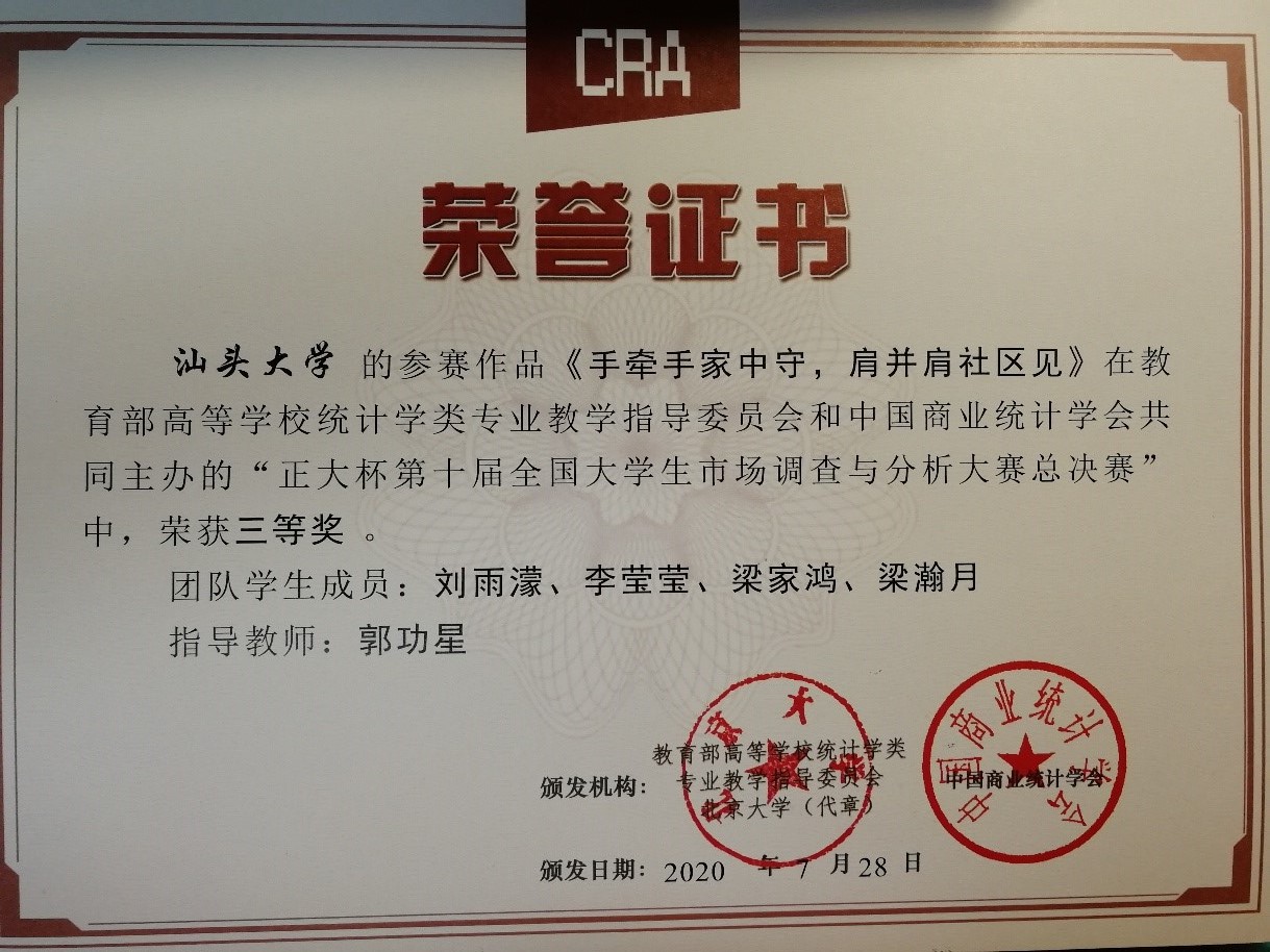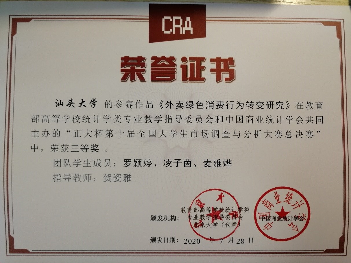 2020年7月28日,由教育部高等公司统计学类专业教学指导委员会、中国商业统计学会共同主办,暨南大学经济公司统计学系承办的“正大杯”第十届全国老员工市场调查与分析大赛选拔赛圆满结束。bevictor伟德官网派出的2支队伍成功获得全国三等奖。