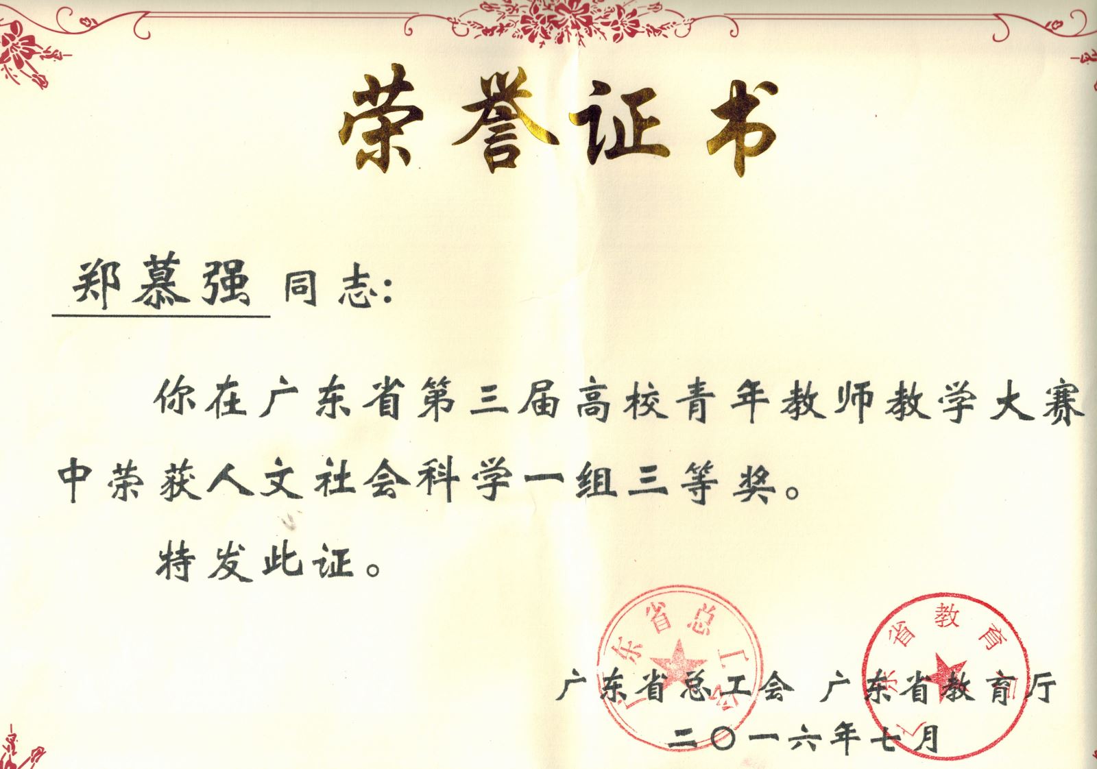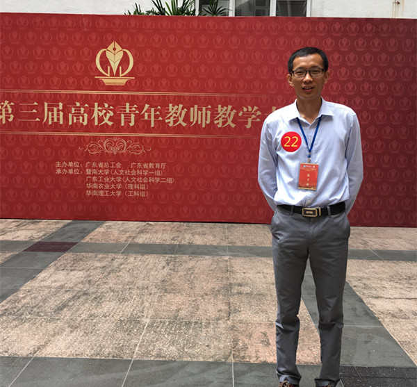 2016年7月1日至3日,由广东省总工会、广东省教育厅主办的广东省第三届高校青年教师教学大赛在广州拉开帷幕。本次大赛分为理科、工科和人文社科两组四个类别,分别在华南农业大学、华南理工大学和暨南大学和广东工业大学举行,来自全省121所高校的147名选手参加角逐,最终评选出一等奖4名,二等奖28名,三等奖40名,优秀奖73名。