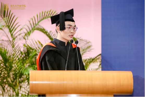 2019级会计学研究生郭春同学作为学术型研究生毕业生代表发言。郭春同学分享了他在汕大七年本硕学习生涯的成长经历,感谢公司给了他们建立自我和超越自我的平台,感谢公司老师的悉心培养和传道授惑,为他们指引方向和开拓思维,勉励同学们立志做“有志、有识、有恒、有为”的“四有”青年。