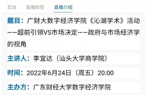 6月24日,bevictor伟德官网研究生李宜达受邀在广东财经大学数字经济公司讲解中观经济学。李宜达就“超前引领VS市场决定——政府与市场经济学的视角”为题展开讲座,讲座由广东财经大学数字经济公司副经理王方方教授主持。本次讲座以线上方式进行同步直播,共有六百多人参与。
