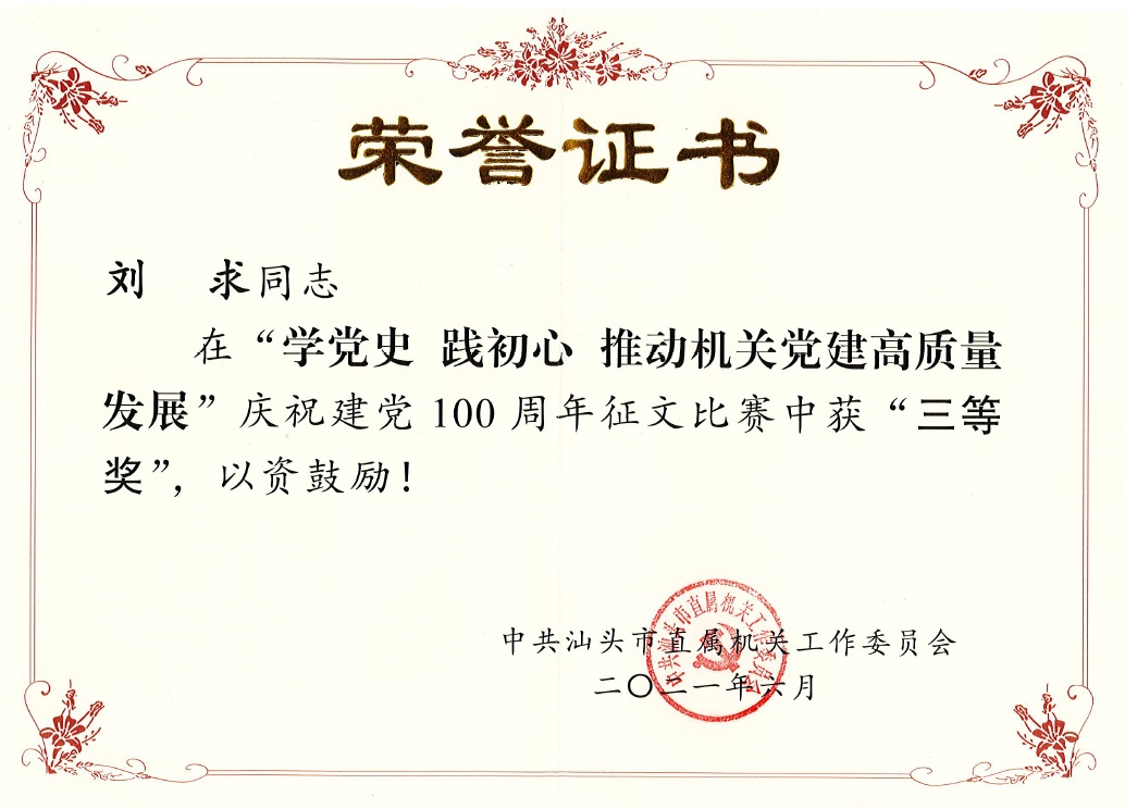 近日,中共汕头市直属机关工作委员会公布了“学党史 践初心 推动机关党建高质量发展”庆祝中国共产党成立100周年征文比赛获奖名单,公司研究生党支部刘求同志在本次比赛中荣获三等奖。