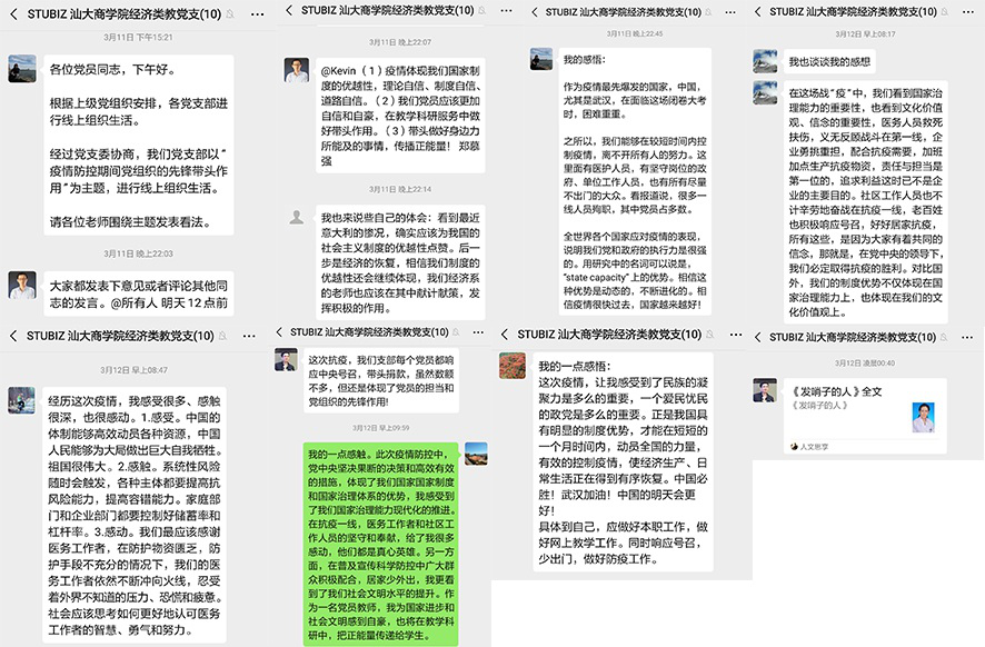 3月11-12日,bevictor伟德官网经济类教工党支部召开了以“疫情防控期间党组织的先锋带头作用”为主题的线上组织生活会。每位党员同志都积极参与,踊跃发言,充分表述自己近期的感悟和体会。活动中,许多党员同志都表示我国目前应对疫情的表现,体现出我国社会文明的水平的提升和中国特色社会主义制度的优越性,在党中央的领导下必定取得此次抗击疫情的最终胜利。同志们对疫情中涌现出的感人事迹纷纷发表了自己的感想:在疫情期间,我们不仅要做好自己身为教师,教书育人的本职工作,积极传递抗疫过程中展现的正能量,同时要思考如何在后续经济的恢复的工作中,结合自己的专业知识,积极献计献策,发挥自身的优势。