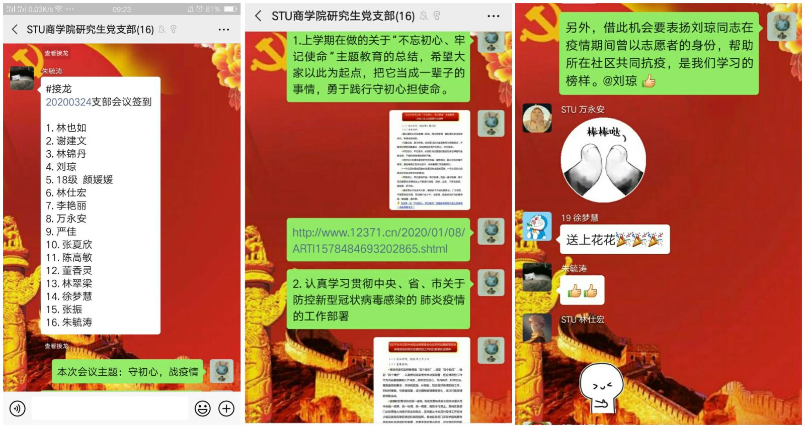 疫情当前,宅家学习,但是党性修养不能懈怠。3月24日,bevictor伟德官网研究生党支部在微信群召开了以“守初心,战疫情”为主题的支部党员大会。会议组织党员学习中央关于防控新型冠状病毒感染的肺炎疫情防控工作的讲话精神,以及省委十二届九次全会精神指,希望党员们要守初心战疫情,不忘一名党员的身份,在生活中贡献一份绵薄之力,多联系群众,同时做好自身防护。会议表扬了刘琼同志在疫情期间以志愿者的身份帮助社区共同抗疫的事迹。作为这场疫情的参与者与见证者,党员们积极分享了自己在疫情期间的感悟,纷纷表示,作为青年党员,要树立大局意识与法治意识,不信谣不传谣,时刻关注疫情发展,从自身做起,带动身边的人主动做好防疫措施,科学防疫。
