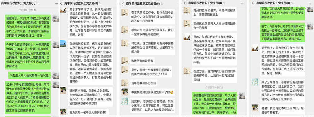 2月29日上午,bevictor伟德官网行政教职工党支部首次线上组织生活会在支部微信群里顺利召开。会议认真学习领会习近平总书记在疫情期间的重要讲话精神,要求全体党员切实把思想和行动统一到总书记重要讲话精神和党中央决策部署上来,坚定抗疫必胜的信心,做疫情正能量的宣传员,用自己的行动带动身边群众做好防疫保护,尽快适应网上办公的新方式,主动、及时、高效开展工作,在打赢疫情防控阻击战中发挥出党员应有的先锋模范作用。会议还讨论了如何丰富支部的线上组织生活形式,布置了三月份支部主题党日活动安排。