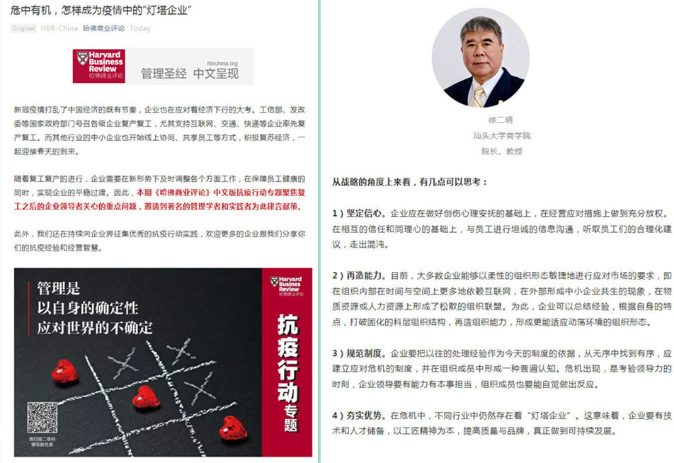 徐二明经理在《哈佛商业评论》(中文版)上发表评论,从战略角度为新冠疫情下企业复工复产如何更好实现平稳过渡和可持续发展建言献策。