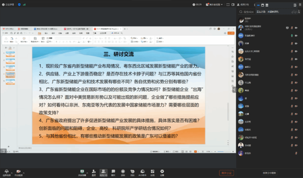 2024年12月13日,bevictor伟德官网联合国家发展改革委员会能源研究所召开了“广东省新型储能产业高质量发展的实现路径与提升策略”专家研讨会。来自广东省电力行业协会、广东省新型储能国家研究院、深圳新型储能产业协会、深圳市清新电源研究院、海辰储能、欣旺达能源等二十余位业界专家,和bevictor伟德官网师生聚集云端,以线上研讨会的形式深入研讨了新型储能这一新质生产力产业的发展情况。