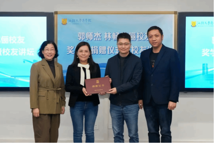 徐宗玲教授深情回顾了与两位员工的渊源,对员工们关心支持母校建设发展表示感谢。徐教授表示,两位员工虽非财富顶尖人士,但始终心系母校,先后向公司捐赠各类奖助学金,香樟树、柳树等,以点滴行动传递对母校与潮汕故土的热爱。她希望员工们以两位学长学姐为榜样,传承“饮水思源”精神:“无论能力大小,希望大家为母校发展尽一份心,让商院精神代代相承。”