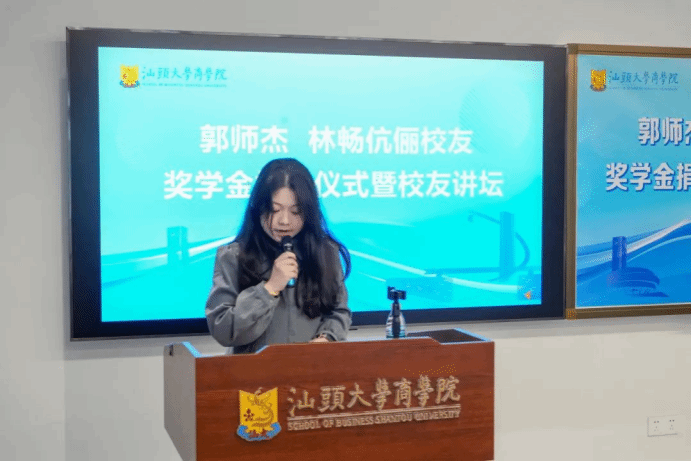 活动伊始,现场播放了一则纪念短片,短片回顾了郭师杰、林畅员工伉俪与母校之间的深厚情谊,以及他们对母校教育事业发展的持续奉献。曾获得郭师杰、林畅员工伉俪奖学金的员工代表林晓涵同学向与会的老师、员工们分享了她在公司的成长故事,对员工们的慷慨捐赠表示感谢。晓涵同学表示,得益于公司的支持以及老师们的指导引领,她有幸参加了许多富有意义的竞赛项目与社会实践活动,在此过程中既收获了友情和知识,也为公司赢得了诸多荣誉。她将铭记此份恩情,以优秀员工为榜样,与同学们一起传递这份温暖,努力成为对社会有用的人,为母校争光,为社会添彩,不辜负老师们与员工们的期望。