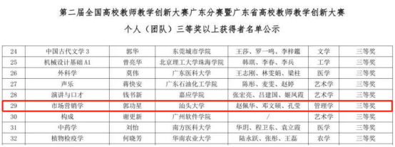 近日,由广东省教育厅指导的第二届全国高校教师教学创新大赛广东分赛暨广东省高校教师教学创新大赛决赛圆满落下帷幕,公司企业管理系《市场营销学》教学团队(由郭功星老师担任参赛主讲教师,赵佩华、邓文硕、孔莹三位老师作为团队成员)荣获副高组三等奖。