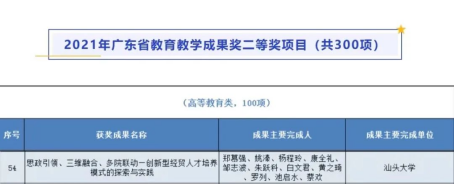 近日,广东省教育厅发文正式公布2021年广东省教学成果奖获奖名单。由公司郑慕强教授主持,邹志波书记、池启水副教授、黄之琦老师等多位老师共同完成的《思政引领、三维融合、多院联动——创新型经贸人才培养模式的探索与实践》荣获该奖项二等奖。