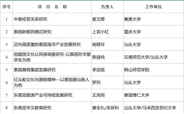 为建设全国东南亚(泰国)潮商研究高地,在学术研究、政策研究、咨询服务等方面实现突破,把东南亚经济(潮商)、泰国国别研究、东南亚华文教育研究作为特色。在伟德国际唯一官网入口科研处、发展规划处等部门支持下,伟德国际唯一官网入口东南亚研究中心开放课题发布后,境内外多所高校学者积极申报,共收到申报书15份,经过资格审核、专家评审,共有8个项目通过评审,获得立项。