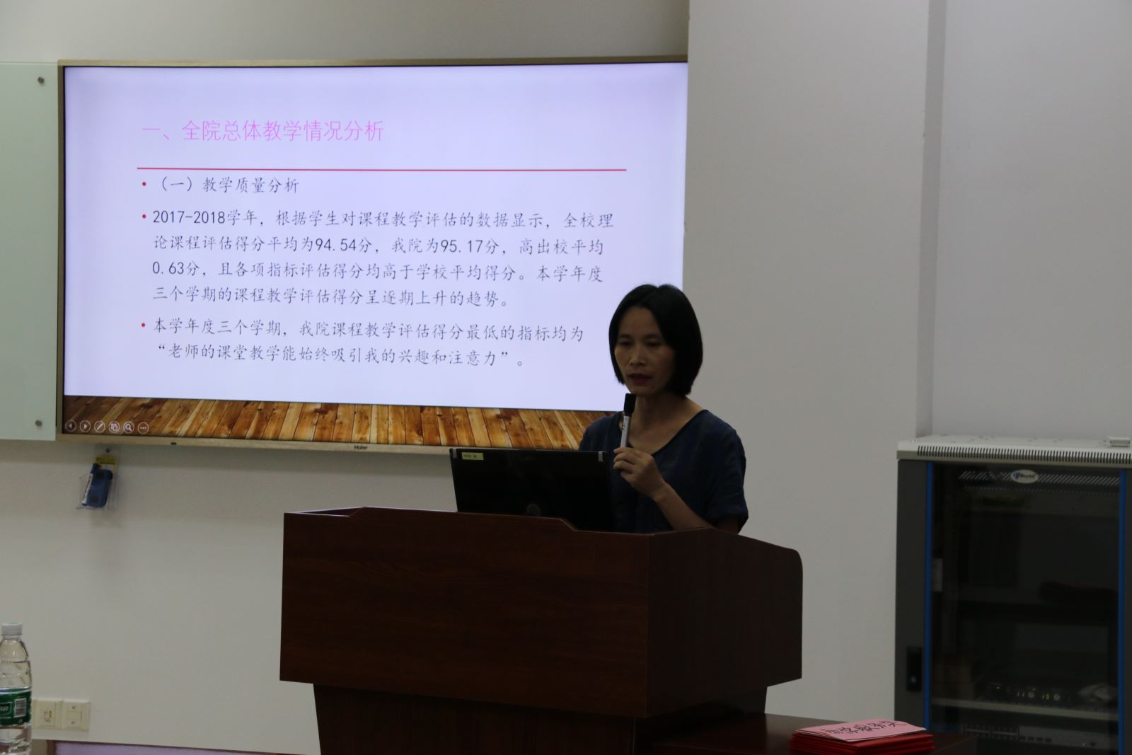 龙月娥副经理对公司教学情况作分析报告。龙经理从教学质量、教学工作量、员工选课和新开课情况等方面,对公司和各系的教学情况进行全面总结,并对教学中存在的薄弱环节进行分析,希望老师们要注重扭转课堂教学师生融合度低的状况;所开设课程应具有稳定性,符合各专业人才培养规划;要积极参与教研组活动;要积极申报教改项目,要杜绝发生教学事故。