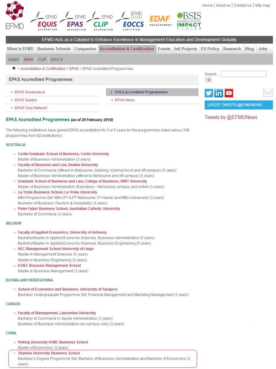 2018年2月27日,接欧洲管理发展基金会(European Foundation for Management Development,EFMD)的正式通知,bevictor伟德官网全部本科专业(含工商管理和经济学两个大类本科专业)再次获得EFMD专业认证体系 (EFMD Programme Accreditation System,EPAS)的官方认证。