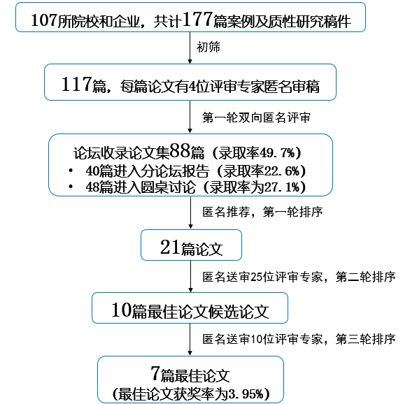 本届论坛共收到来自107所院校和企业共计177篇案例及质性研究稿件。经匿名处理后,由程序委员会初筛通过117篇,拒稿60篇。初筛通过的稿件进入双向匿名评审,递送海内外234位领域内评审专家进行评审,每篇论文邀请4位匿名评审专家评审,整个论文评审和筛选过程竞争激烈,评审要求非常严格。