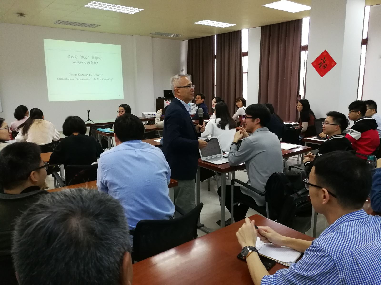 2018年3月19日上午,深圳大学管理公司特聘教授周南教授受邀莅临汕大,在公司三楼学术研讨室做题为“差序格局与文化安全——为什么星巴克‘败走’紫荆城”的学术讲座。讲座由郭功星助理教授主持。