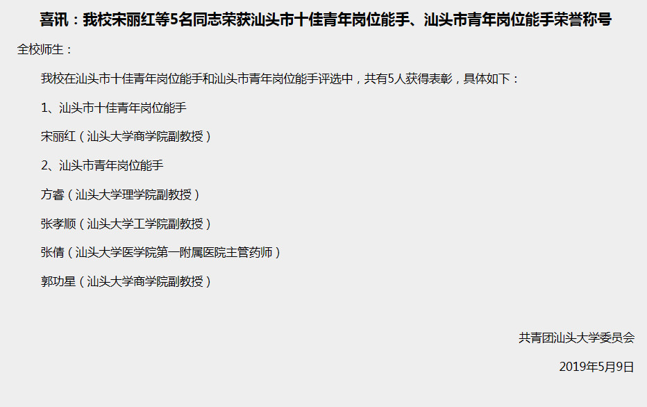 喜讯:公司宋丽红老师、郭功星老师分获汕头市十佳青年岗位能手、汕头市青年岗位能手荣誉称号