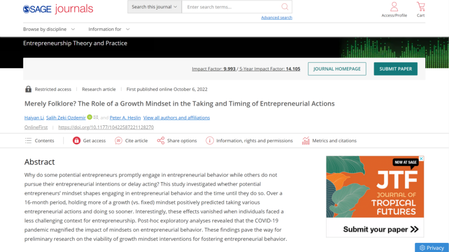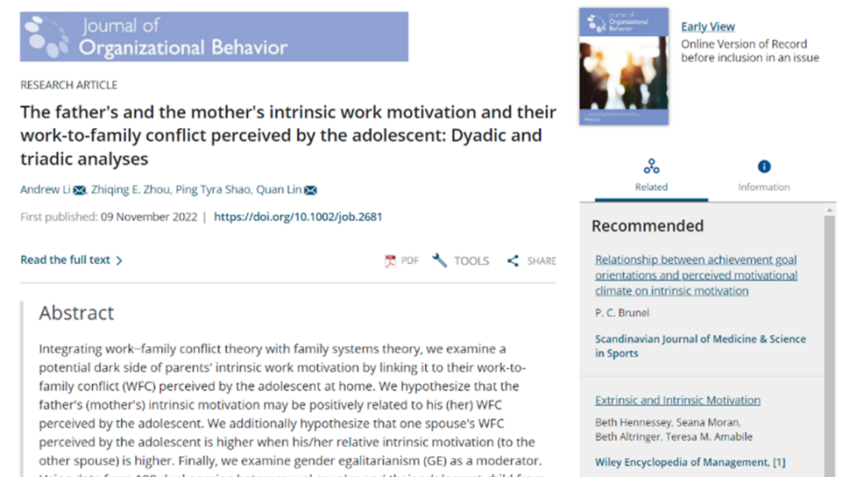 公司周军杰副教授(第一作者)互联网医疗健康交叉研究成果,分别被商科国际顶级期刊MIS Quarterly(UTD24期刊)、顶级商业评论California Management Review接受;林泉教授以通讯作者身份参与合作完成的论文《The father's and the mother's intrinsic work motivation and their work-to-family conflict perceived by the adolescent: Dyadic and triadic analyses》被国际管理学顶级期刊Journal of Organizational Behavior接受并在线发表;青年教师李海燕博士(第一作者)参与合作的论文《Merely Folklore? The Role of a Growth Mindset in the Taking and Timing of Entrepreneurial Actions》在国际顶级期刊Entrepreneurship Theory and Practice 在线发表。