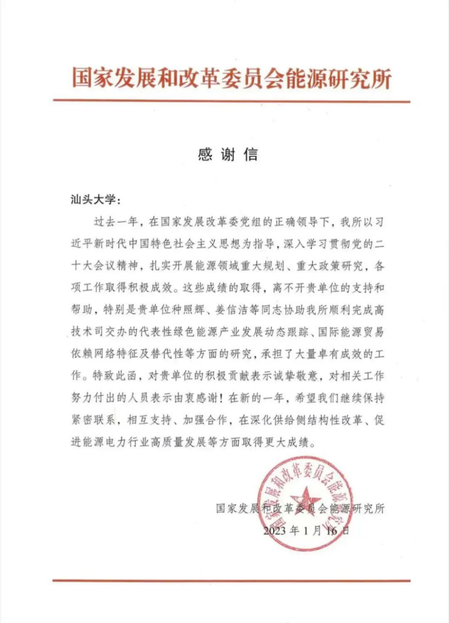 国家发展和改革委员会能源研究所向公司发来感谢信,对公司台湾研究所所长种照辉副教授团队积极参与“能源产业政策课题”重要研究工作表示感谢。