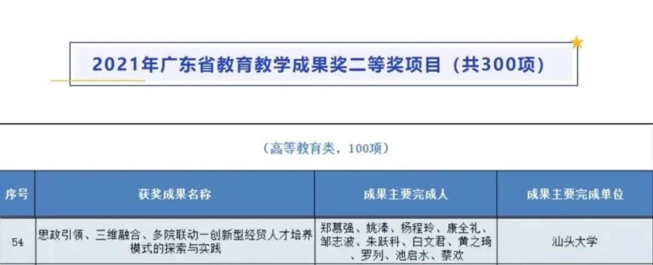 公司郑慕强老师主持的教学成果《思政引领、三维融合、多院联动——创新型经贸人才培养模式的探索与实践》,获2021年广东公司产品成果奖二等奖,延续公司教师在近三届省级教学成果奖评选中都有获奖的记录。
