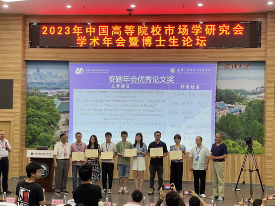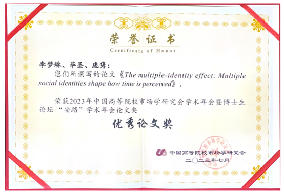 2023年7月14日至16日,由中国高等院校市场学研究会主办、武汉大学经济与管理公司承办的“2023年中国高等院校市场学研究会学术年会暨博士生论坛”在武汉顺利召开。公司企业管理系李梦琳老师与合作者完成的论文《The multiple-identity effect: Multiple social identities shape how time is perceived》在数百篇投稿论文中脱颖而出,荣获本届会议的“安踏”学术年会优秀论文奖。