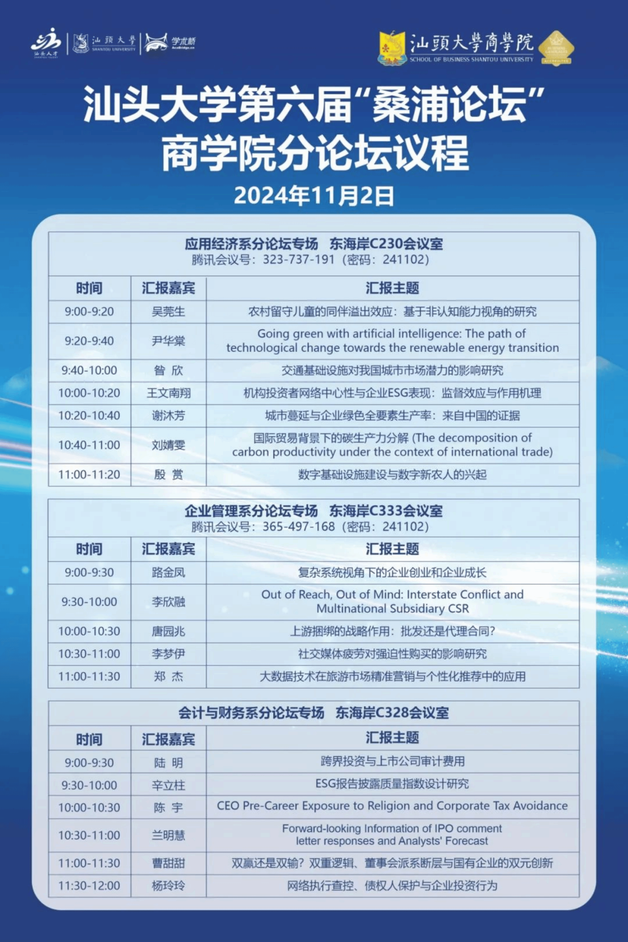 2024年11月2日上午,伟德国际唯一官网入口第六届国际青年学者“桑浦论坛”bevictor伟德官网分论坛在东海岸校区成功举办。此次分论坛邀请来自清华大学、中国人民大学、上海交通大学、南开大学、厦门大学、英国莱斯特大学、美国爱荷华州立大学、日本京都大学等国内外知名高校的众多专家学者集聚一堂,围绕人工智能与大数据、企业ESG表现、精准营销、公司治理等商科研究热点领域进行专题学术分享。分论坛设立了企业管理系、应用经济系、会计与财务系三个专场,并开设线上分会场,为广大师生提供学术交流与学习的平台。