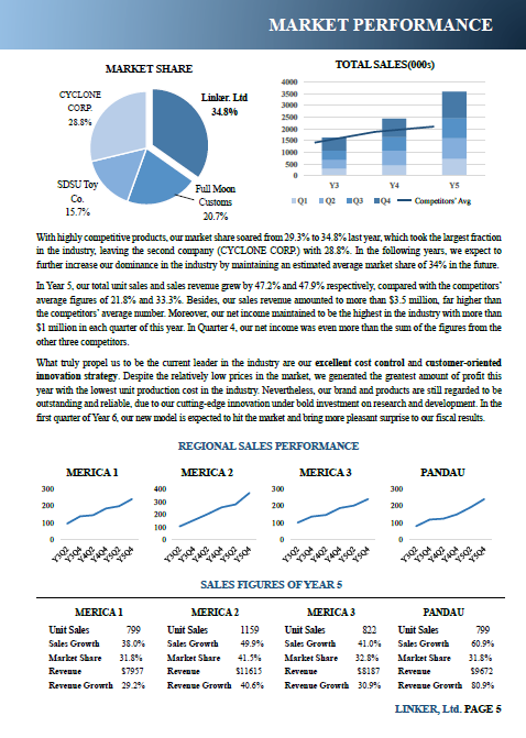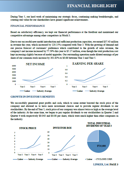 When the competition went close to the final phase, Team Linker kept its competitive advantages and performed stably, with stock price, ROI, market share, net income and other critical criteria remaining the first place in the industry. Below are the two pages indicating the excellent operation results of Team Linker from the Annual Report that was later chosen as the First-Place Outstanding Report.