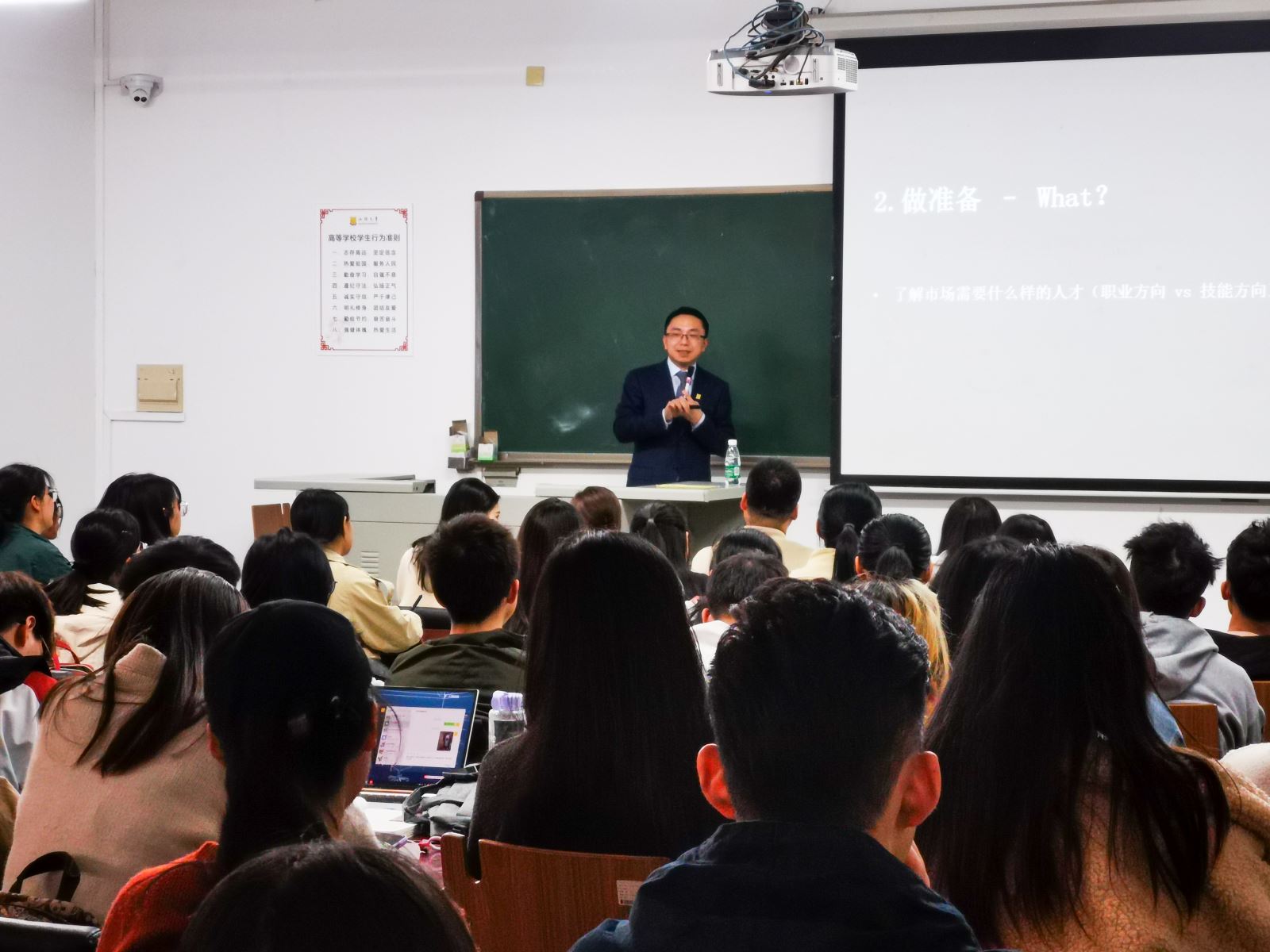 随后,郑宇师兄又与同学们畅聊了关于自己的职业成功历程,从大学期间准备司法考试,到百里挑一去法国最好的律所交流学习,再到如今的君合律师事务所合伙人,让同学们明白他是如何一步步地通过自己的学习与努力得到如今的成功。