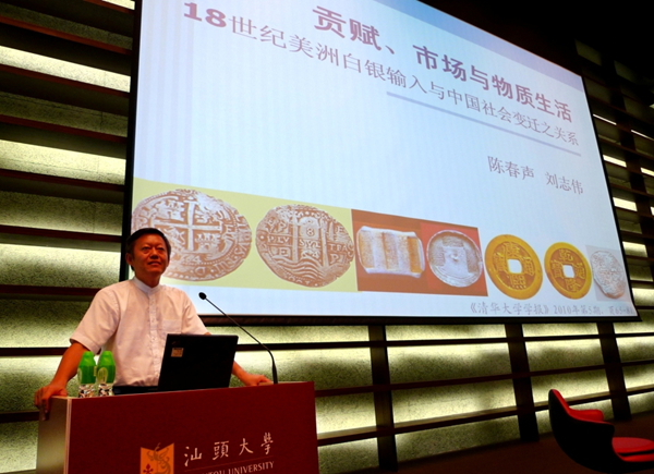 Professor Chen started his lecture with a prelude story that took place in Guizhou Province. He then went on to present his arguments in four topics, including the relationship between American silver and the restructure of the Chinese tax system during the 1600s and 1800s, the reason inflation did not occur in 19th century China, the report of food price and exchange rate between silver and currency, the causal relations between the outbreak of the Opium War and the tax system, and the logistics of timber.