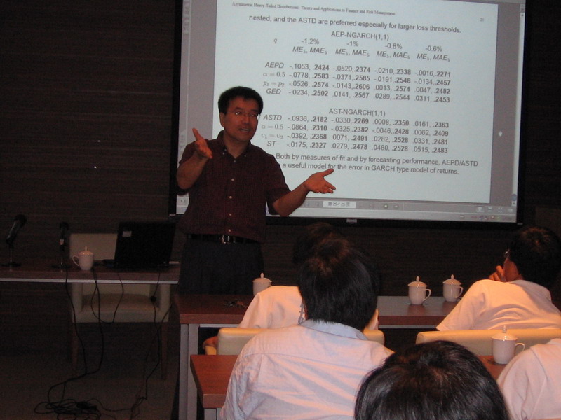 At the beginning, Dr. Zhu introduced his research purpose, that is, financial data has the characteristics of heavy-tailed and asymmetric distribution, and the currently and widely used distribution can not fit the characteristics of the data well; then Dr. Zhu, associating his own papers, used easy-to-understand language to explain how to structure and prove his expansion of the distribution function.