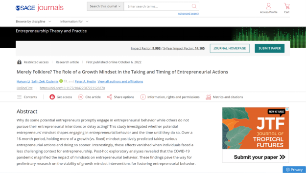 Recently, a paper by our young faculty member Dr. Haiyan Li (first author) in collaboration with Associate Professor Salih Zeki Ozdemir and Professor Peter A. Heslin of the University of New South Wales, Australia , "Merely Folklore? The Role of a Growth Mindset in the Taking and Timing of Entrepreneurial Actions" was published online in the top international journal Entrepreneurship Theory and Practice, which enriched the academic research system of our institute.