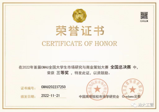 Under the guidance of Business School faculty Professor Li Ziying and Professor Kong Ying,the team project named Murder Mystery Game Industry Research and Trend Analysis Report participated by Liu Meichen, Huang Yuqi, Deng Xiaomin, Ou Yuhao, and Wang Jiamin from the Department of Business Management won the national third prize in the final. Meanwhile Excellent Instructor Award went to two instructors.