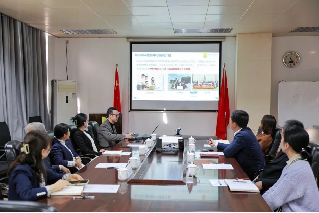 On the afternoon of February 22nd 2023, the Acting Dean of Cheung Kong Graduate School of Business (CKGSB) Yan Aimin, director of the External Affairs Department Chen Jun, Senior Manager of the External Affairs Department Wang Yunqi and Assistant of External Affairs Department Chen Kunkun, came to our school for exchange. Party (CPC) Secretary of Business School Zou Zhibo, dean of Business School Liang Qiang, and Dr. Meng Shu of MBA Education Center attended the meeting.