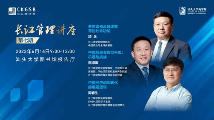 On the morning of June 16, 2023, the 7th session of the 'Yangtze River Management Lecture Series' jointly organized by the School of Business at Shantou University and Changjiang Business School, was successfully held in the lecture hall. The lecture was hosted by Professor Liang Qiang, Dean of the School of Business at Shantou University and Director of the MBA Education Center. Distinguished guests in attendance included Professor Yan Aimin, Vice Dean of Changjiang Business School, Professor Xu Zongling, Chairman of the Shantou University Education Foundation and Professor at the School of Business, as well as Ms. Chen Jun, Deputy Director of the Department of International Affairs and Campus Development at Changjiang Business School.
